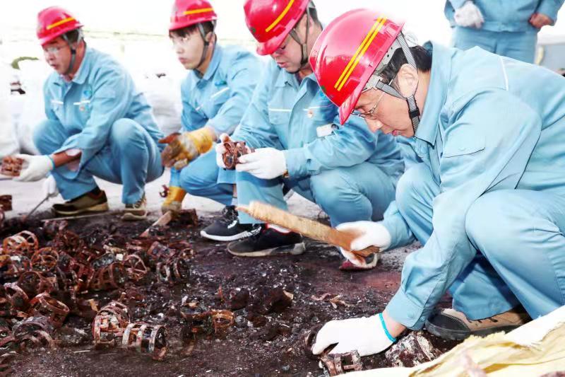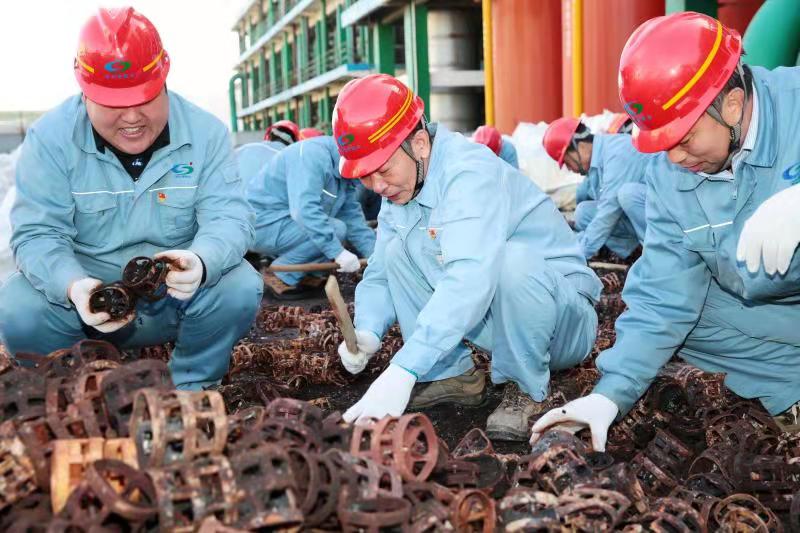 勞動現場,大家有的用木棍敲打填料,有的裝填包裝袋,有的將裝袋的填料擺放整齊……一個個忙得不亦樂乎。三個多小時終于完成了所有填料的清理工作,不僅解決了基層的困難,為蒸餾塔的檢修節(jié)約了時間,并且共回收可用填料25立方,為企業(yè)節(jié)約了一筆可觀的費用。
