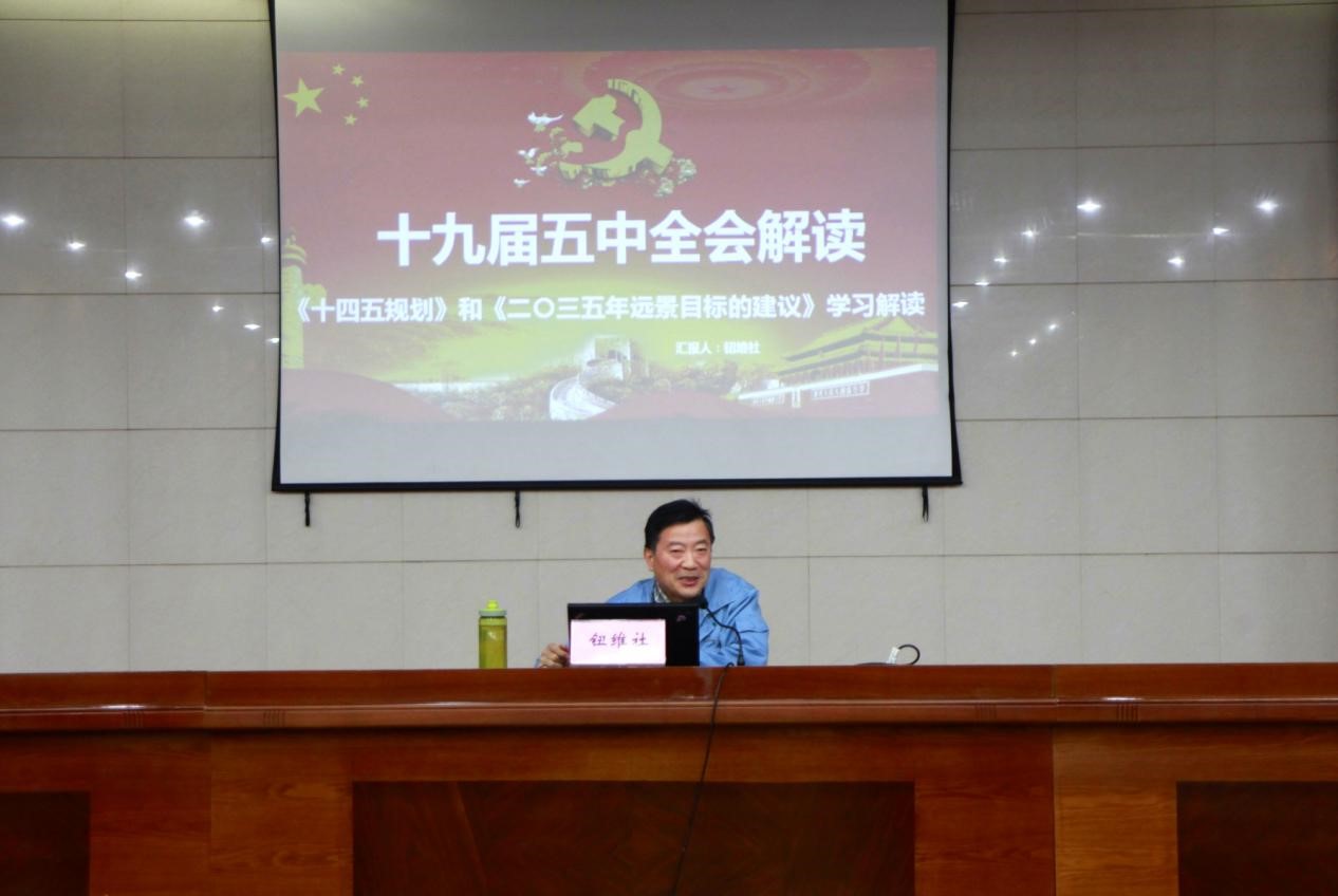 會(huì)上,鈕維社從“十九屆五中全會(huì)簡介”、“全會(huì)召開的背景和意義”、“回眸與展望”、“二0三五年遠(yuǎn)景目標(biāo)”、“十四五規(guī)劃”五個(gè)方面,結(jié)合具體事例,用通俗易懂的語言進(jìn)行了全面準(zhǔn)確的闡述,對(duì)我們認(rèn)真領(lǐng)會(huì)、準(zhǔn)確把握十九屆五中全會(huì)精神實(shí)質(zhì)具有十分重要的意義。
