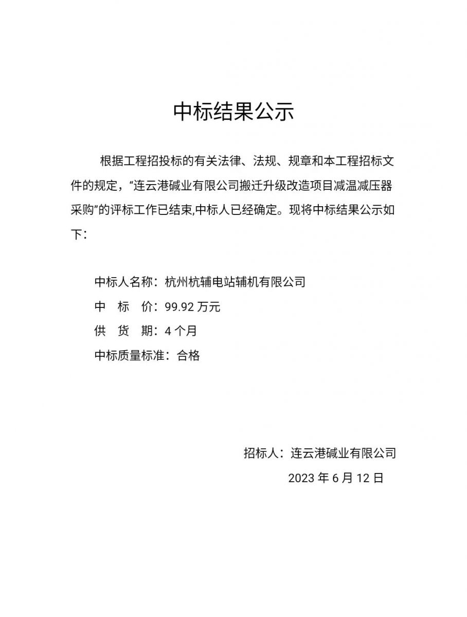 減溫減壓器中標(biāo)結(jié)果公示